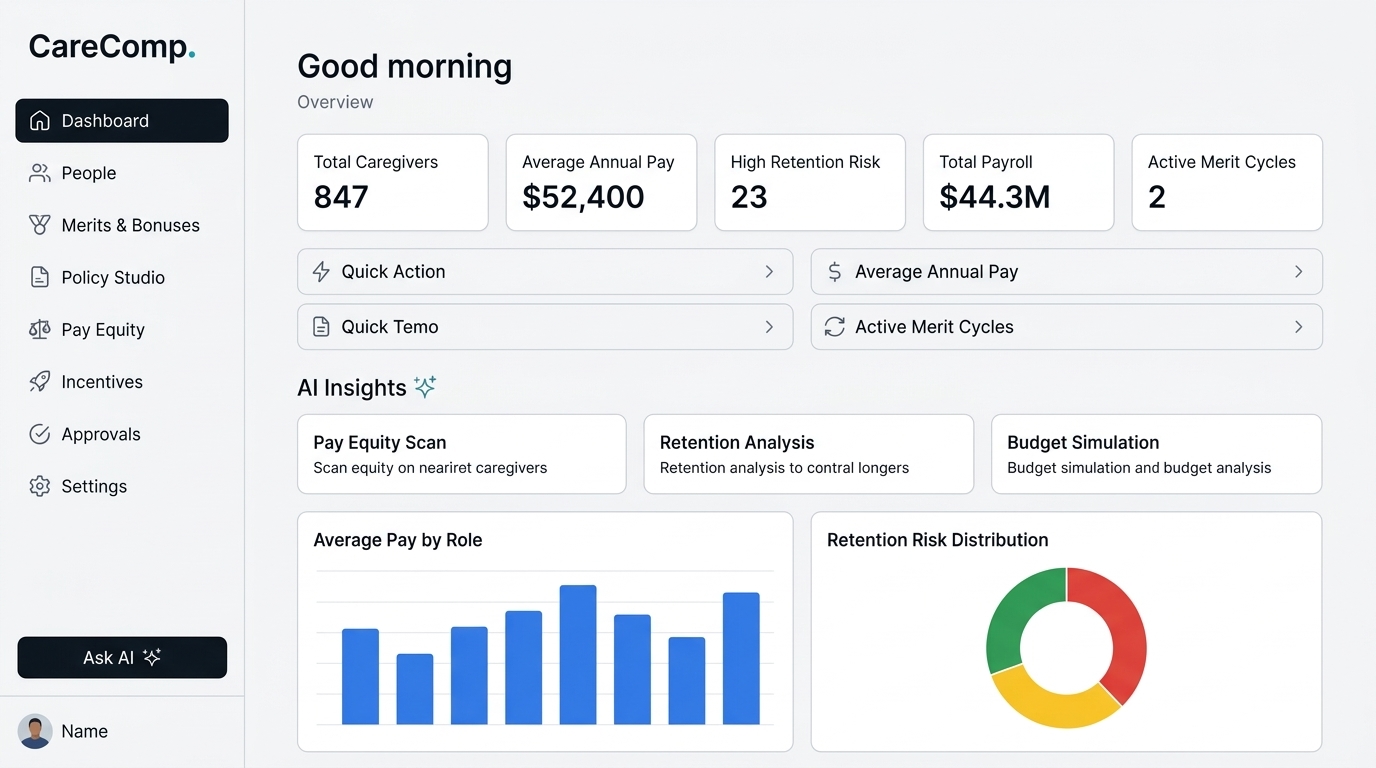 "CareComp AI is the first AI driven compensation platform built specifically for long term care, skilled nursing, assisted living, and home care teams, combining merit planning, pay equity, and retention incentives in one product."